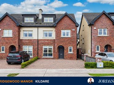 IMMACULATE 4 BED DETACHED DORMER IN SOUGHT AFTER AREA Jordan Auctioneers are delighted to present this impressive four-bedroom detached family home, ideally positioned in a quiet cul-de-sac within the highly sought-after Curragh Grange development. Built in 2004, Curragh Grange is a modern and well-established residential enclave comprising a mix of attractive semi-detached and detached homes. The location is exceptionally convenient, situated just off the Green Road and Athgarvan Road, and within walking distance of Newbridge Town Centre and the renowned Curragh Plains, which extend to approximately 4,500 acres of open parkland, ideal for walking, running and cycling. The development also benefits from a neighbourhood centre with a convenience store, pharmacy, hair salon and medical practice on your doorstep. This attractive home extends to approximately 150 sq.m. (c. 1,615 sq.ft.), offering bright, well-proportioned accommodation presented in good condition throughout. The property features gas-fired central heating, PVC double glazed windows, solar panels (heats water only), EV charger, composite front door and a solid fuel stove, together with a newly fitted modern kitchen with quartz worktops, Belfast sink and 4-in-1 multifunction tap. Additional features include a conservatory, water softener, four generous bedrooms and three bathrooms, making this an ideal home for modern family living. The ground floor comprises a welcoming entrance hall with tiled flooring, leading to a spacious sitting room with bay window, laminate flooring, wall lighting and solid fuel stove. To the rear, the kitchen / dining room is fitted with a stylish modern kitchen featuring quartz worktops, Belling range cooker and integrated appliances, with French doors opening to the conservatory, which in turn provides access to the rear garden. A utility room, plumbed and housing the gas burner, is located off the kitchen. Also on the ground floor are two bedrooms with oak flooring and a shower room, offering excellent flexibility for family use or home office space. Upstairs there are two generous double bedrooms, both with fitted wardrobes and ensuite bathrooms, completing the accommodation. Externally, the property is approached by a large cobblelock driveway with landscaped front garden. There is side access on both sides of the house, leading to a beautifully maintained two-tier south-west facing rear garden, enclosed by walls and featuring paved areas, flower beds, water feature, outdoor socket, external tap and a metal garden shed?an ideal space for relaxing and entertaining. Newbridge is a thriving provincial town offering an excellent range of educational, recreational and shopping facilities. Retail options include Tesco, Dunnes Stores, Lidl, Aldi, Penneys, TK Maxx and Newbridge Silverware, together with the Whitewater Shopping Centre, which features over 75 retail outlets, a food court and cinema. The renowned Kildare Village Outlet Shopping Centre is also just a 10-minute drive, offering designer shopping at discounted prices. The area benefits from excellent road and rail connectivity, with convenient access to the M7 Motorway at Junction 12 (Ballymany), bus routes available from the Green Road, and a regular commuter rail service from Newbridge providing direct access to Heuston Station and Grand Canal Dock. A wide range of sporting and leisure amenities are available locally, including GAA, soccer, hockey, athletics, basketball, swimming, horse riding, fishing, canoeing and golf, together with numerous gyms and leisure centres. The renowned racecourses at The Curragh, Naas and Punchestown are all within easy reach. Outside Approached via a large cobble loc drive to front with landscaped gardens to front. Side access on both side of house with gates leading to a 2 tiered south west facing rear garden with lawn, water feature, flower beds, paved patio area, external sensor lighting and all walled in. Services Mains water, mains drainage, refuse collection, gas fired central heating (can be controlled by app), alarm system (can be controlled by app), water softener, 4 in 1 multi-functional kitchen tap, solar panels (heats water only) and EV charger. Inclusions Carpets, blinds, Belling range cooker, extractor, fridge and metal garden shed.